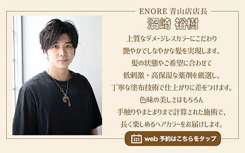 こんにちは。ケアブリーチと弱酸性カラーが得意な美容院ENORE(エノア)青山店店長沼崎です。