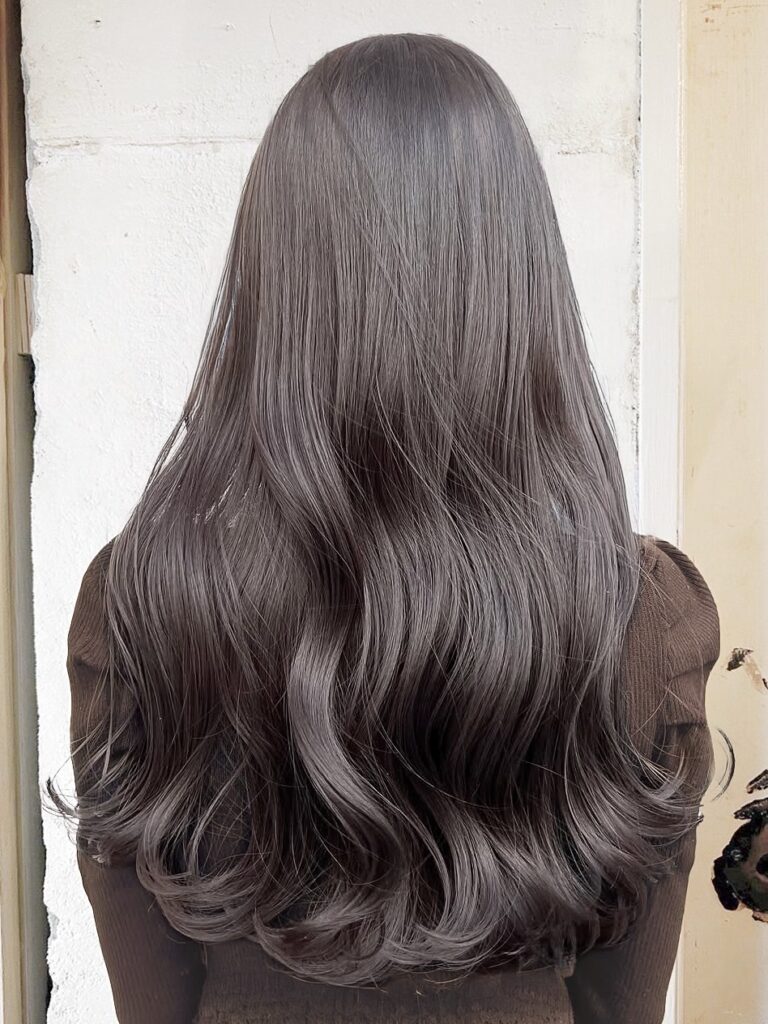 アッシュグレーの透明感が光に透けるたび、髪の美しさを引き立ててくれます。