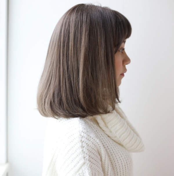 自然で柔らかな透明感を楽しめるアッシュミルクティーの内巻きボブ。