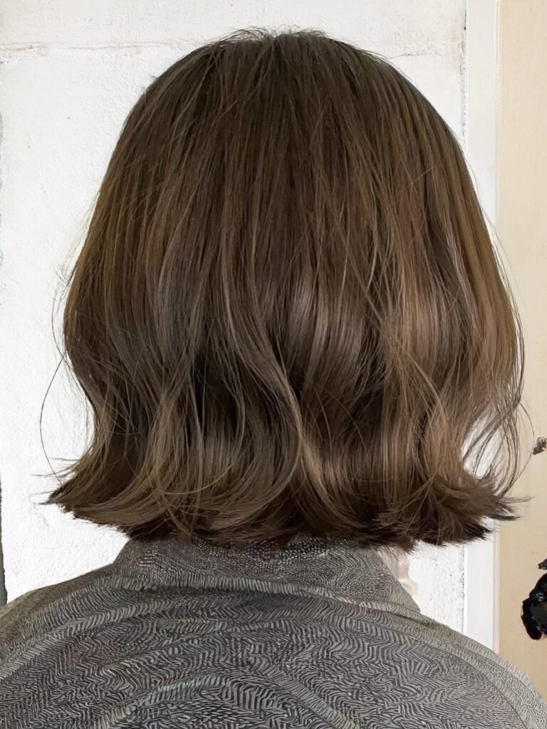 柔らかなベージュ系カラーにアッシュのくすみ感が加わることで、肌の明るさを引き立て、顔まわりをふんわりと優しい印象に見せてくれます。
