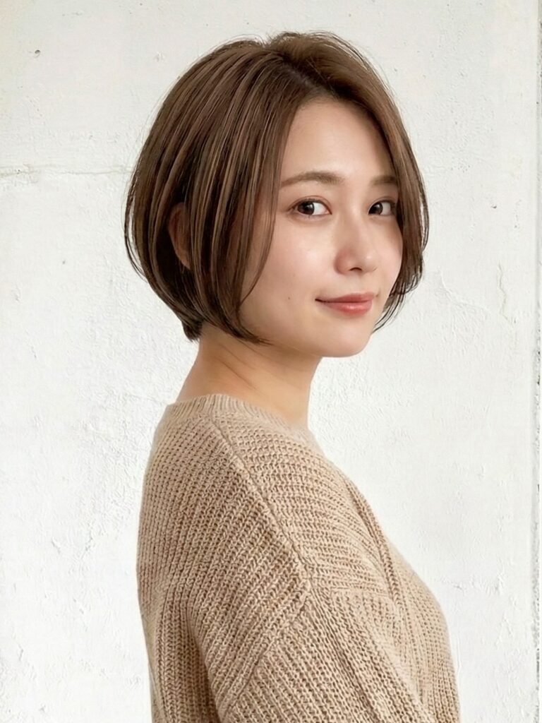 少しレイヤーを入れた内巻きショートに、暗めのミルクティーベージュを組み合わせた上品なスタイルです。