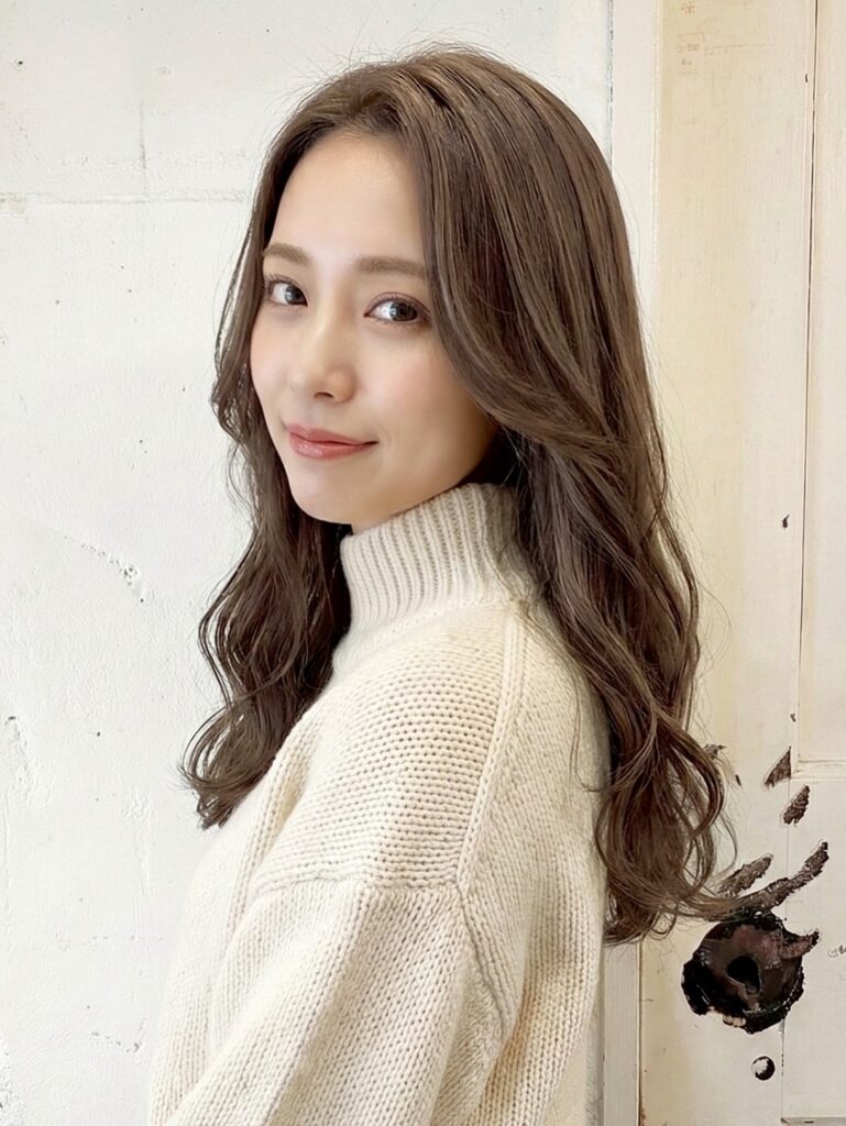 毛先を自然に流したミディアムに暗めのミルクティーベージュを合わせることで、派手になりすぎず、洗練された印象になります。