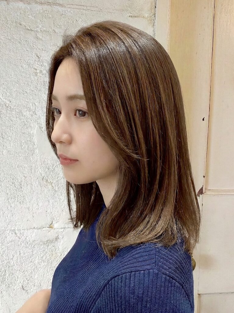 ミルクティーベージュならではの色味と、ツヤのある質感も楽しみたい方におすすめなミディアムスタイルです。