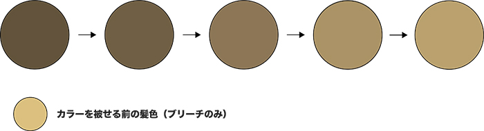 ブラウンの色落ちは、薄いブラウンから黄みのあるベージュへと変化します。