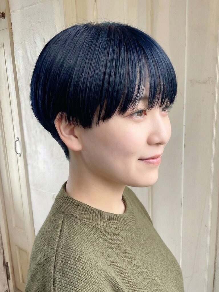 前髪ありだと子どもっぽくなりやすいショートでも、ブルーブラックに染めれば大人っぽい雰囲気に。