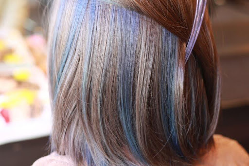 黒髪ベースにブルーのハイライトがアクセントとなったショートボブ。