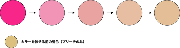 またブリーチありだと「1〜2週間(早いと数日)」ブリーチなしだと「1ヶ月前後」でピンクの色落ちが気になり始めるでしょう。