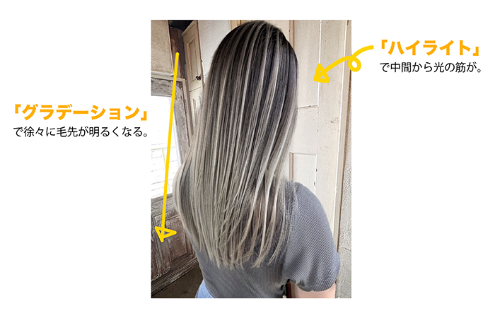 ハイライトとグラデーションカラーを合わせたデザインになっていて、表面がホウキでサッと掃いた様に軽やかに明るくなるデザインカラーです。外人さん風の柔らかな髪に見え、巻いたりアレンジする事で色の出方が変わってとってもおしゃれなんですよ!