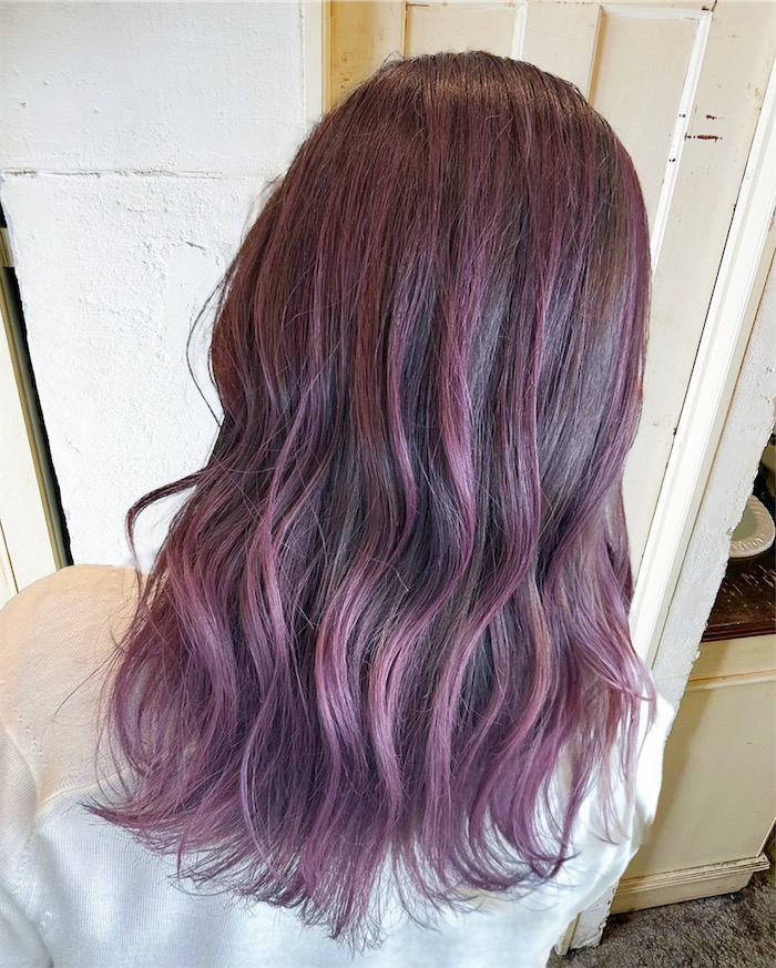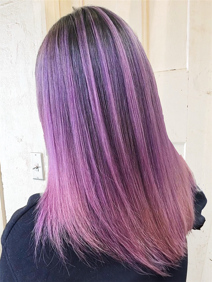ピンクラベンダーはラベンダーのくすみ感のある落ち着いた色合いが人気の髪色です。特に黒髪ベースのバレイヤージュ(シャドールーツとして)の組み合わせがおすすめです!