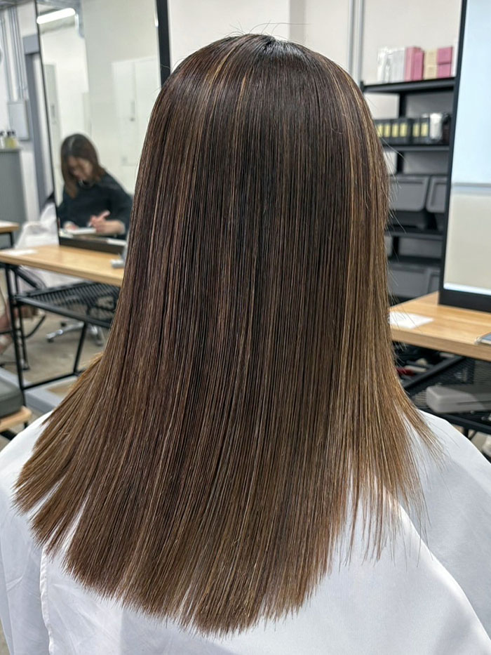 ナチュラルな仕上がりだけど、バレイヤージュによるハイライトとグラデーションの効果で重たくならず、髪に柔らかさと軽やかさが出るのも魅力!