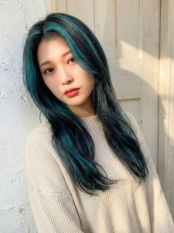 青・黒・白のコントラストが際立つオリジナリティあふれるヘアカラーです。