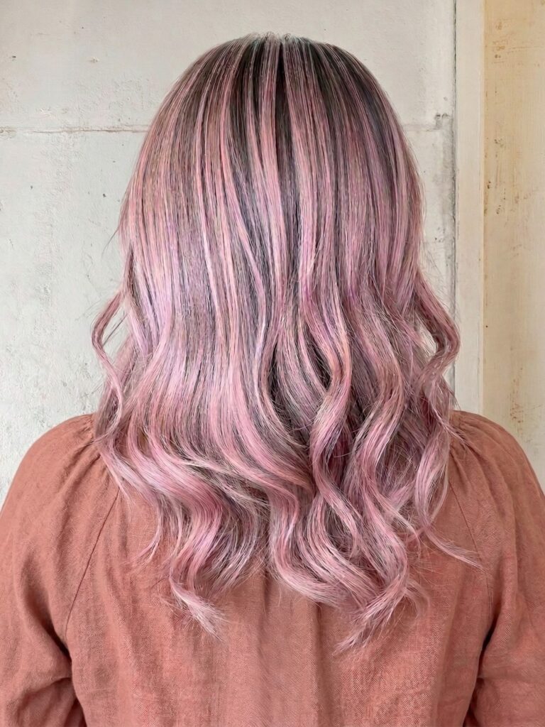- 5.10 巻き髪セミロング×ピンクベージュのハイライト・グラデーションカラー