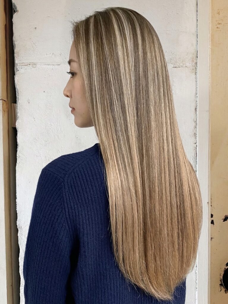 とても人気のあるカラーですが、細かく毛束を取って筋状に染めるため、伸びたときの染め直しに時間がかかる場合があります。