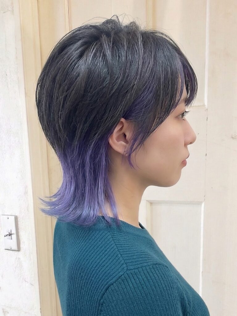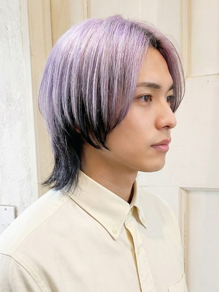 アンブレラカラーはマッシュやウルフなど、トップの髪が長く、前髪を下ろすようなスタイルに向いています。