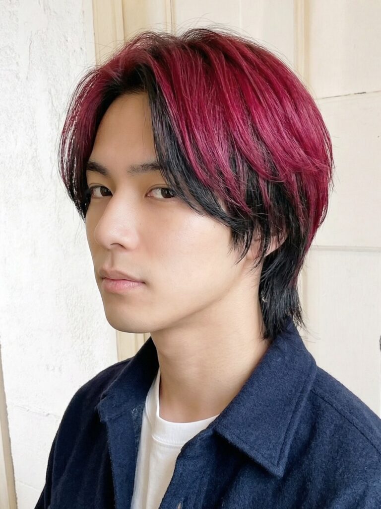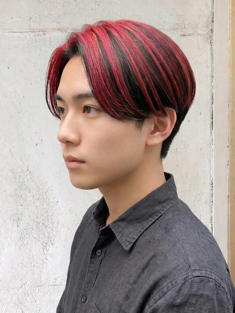 鮮やかなレッドが襟足の長さを強調し、ひとクセあるヘアスタイルに仕上がります。