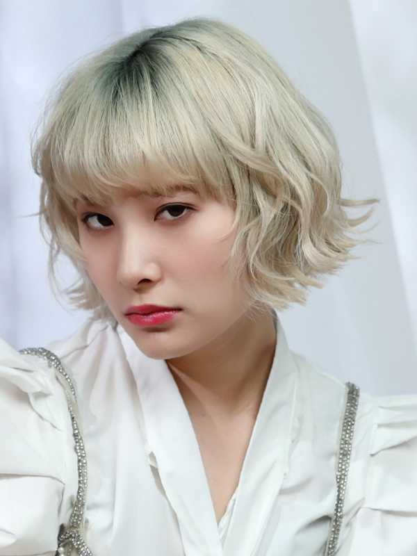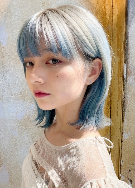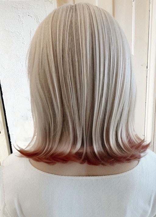 セミロングの長さを活かし、色の範囲を広めに染めることで、インパクトの強い髪色に。