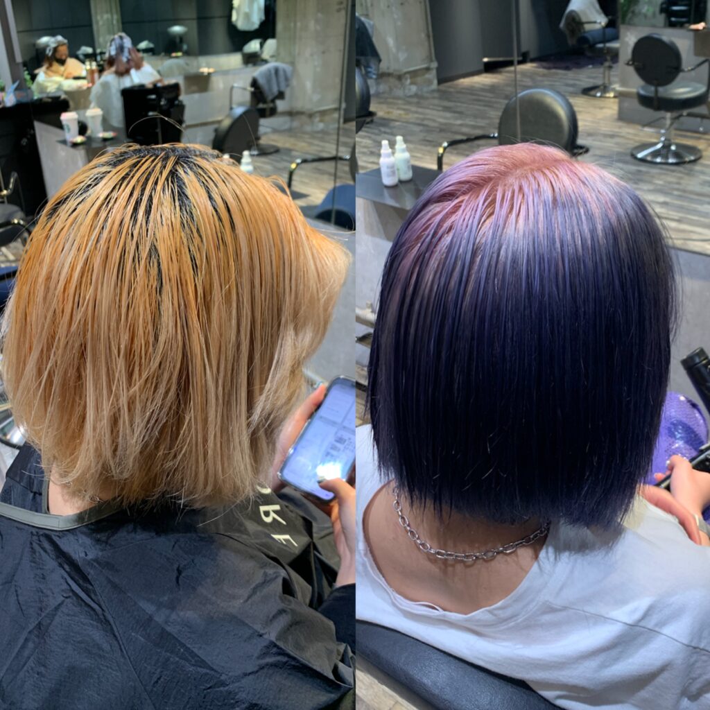 「ライトナー」という明るく染まるカラー剤で色を抜いてから、好みのカラーに染めることできれいに発色します。