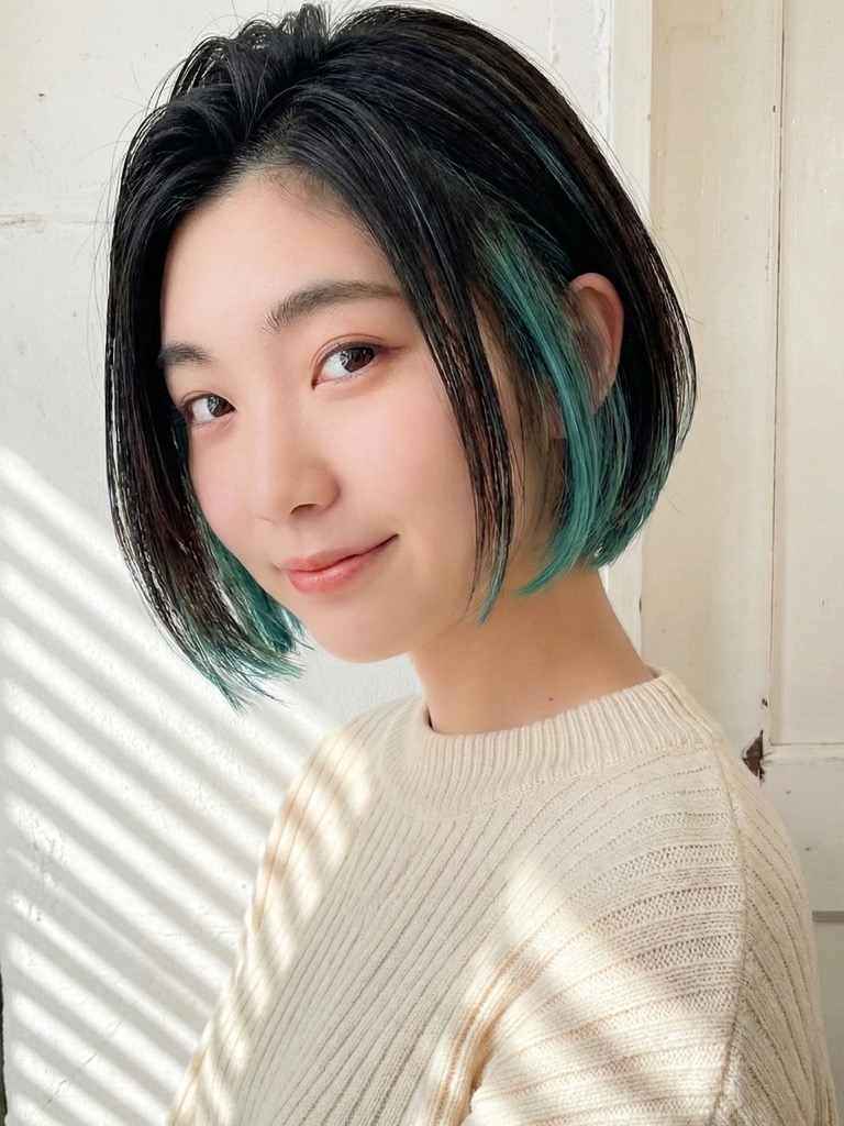 ターコイズグリーン×黒髪ベースのエンドカラー&イヤリングカラー|ボブ