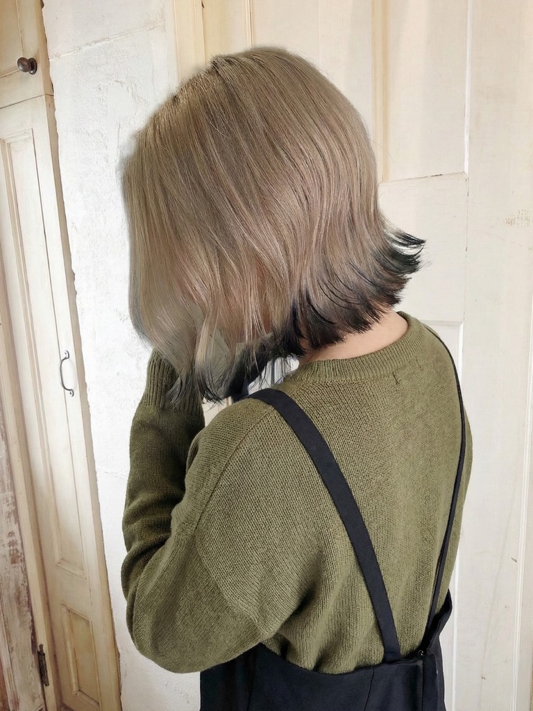 アッシュベージュ×黒髪ベースのエンドカラー|外ハネボブ