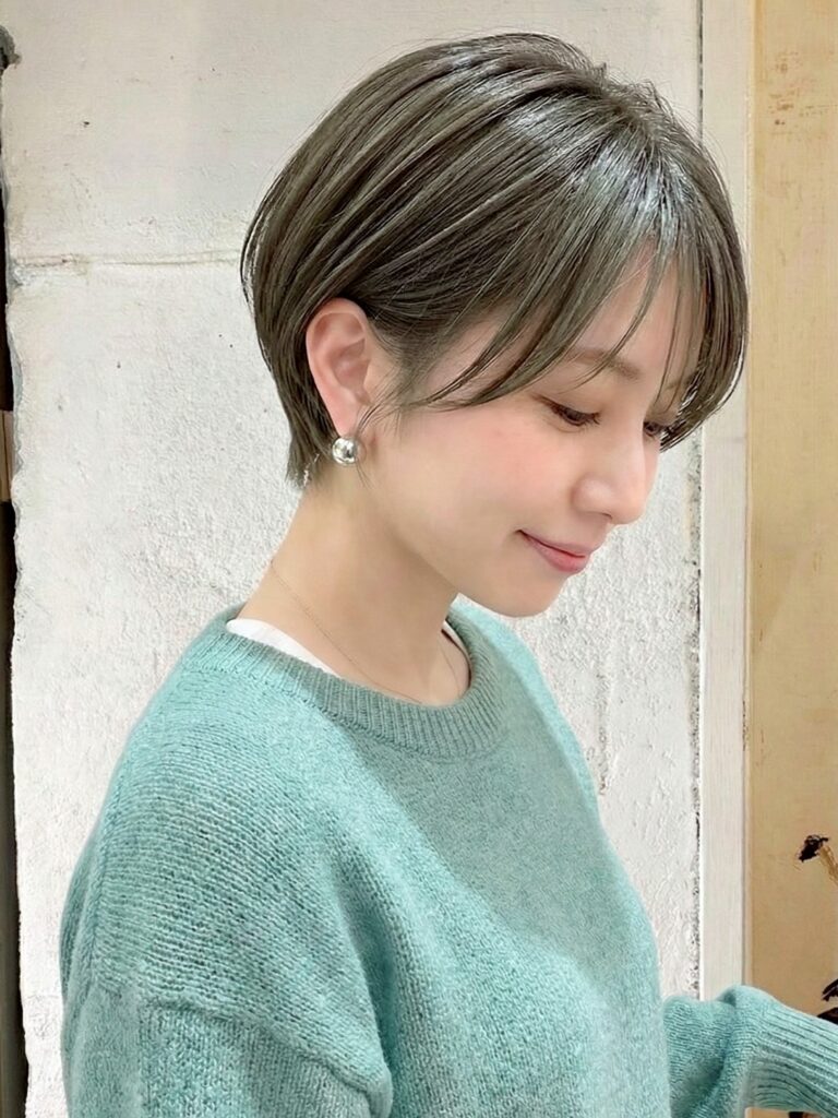 柔らかな光に映える、ミント多めのミントアッシュを取り入れた上品ショートスタイル。