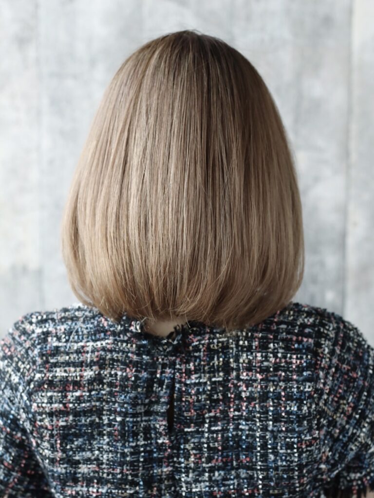 長めに設定したボブに内巻きの丸みを加えることで、ハイトーンでも派手になりすぎず、大人っぽく楽しめるスタイルです。