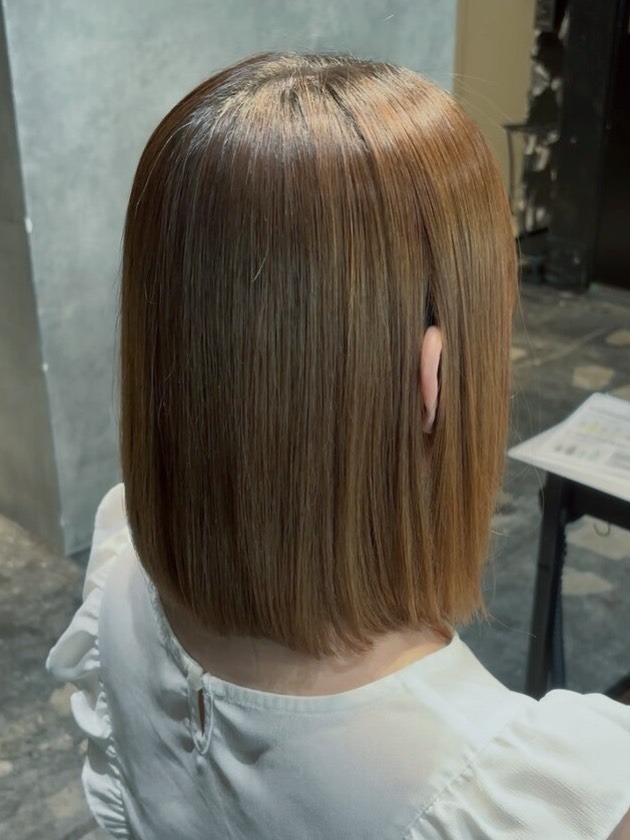 アッシュを多めに配合した、ブリーチありのミントアッシュで染めた外ハネボブです。