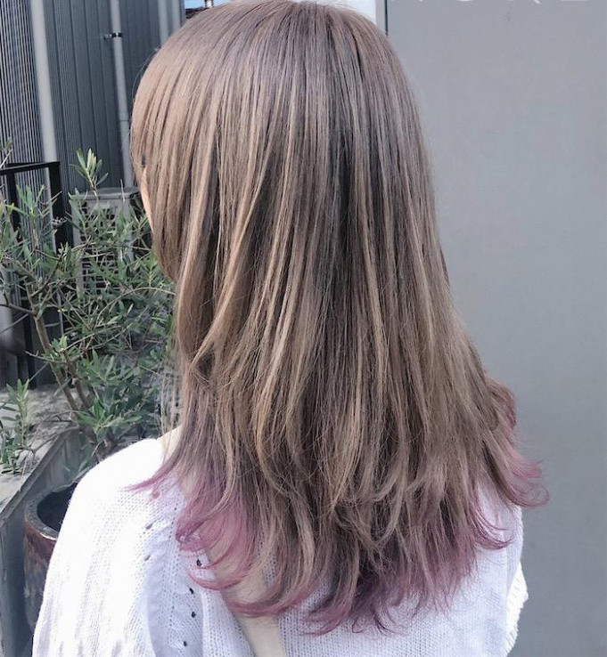 全体をミルクティーに染めた後、毛先にちょこんとラベンダーを入れることで、遊び心のあるカラーに仕上がります。
