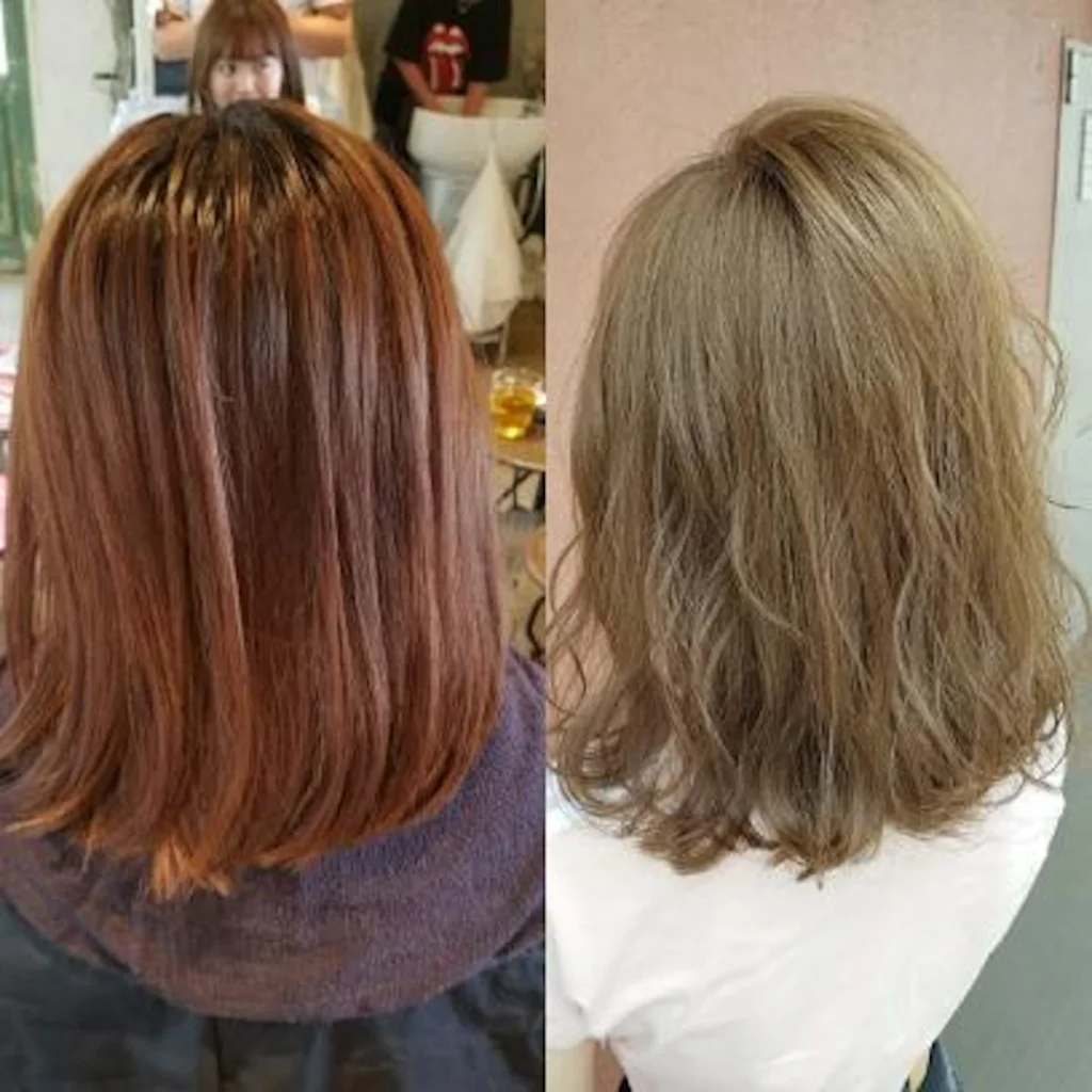 ブリーチをしてから染めることで赤みを抑えられ、まろやかなカラーに染まります。