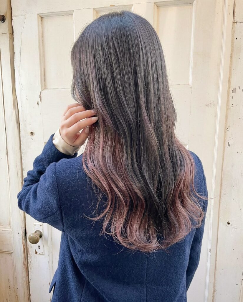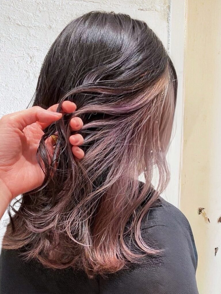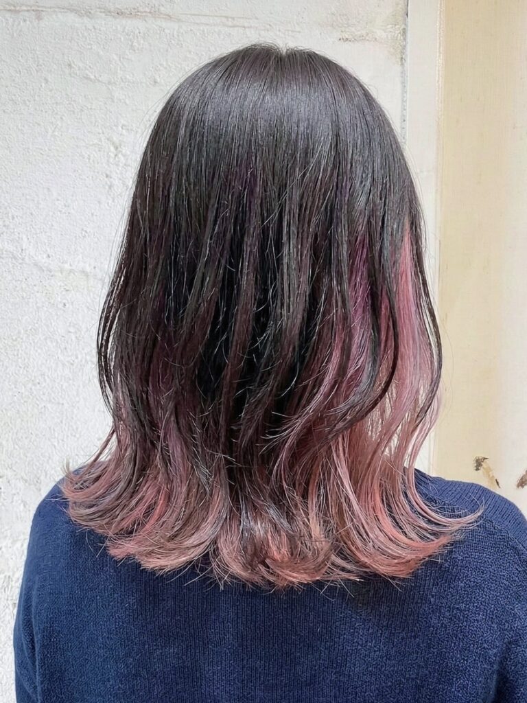 ツヤ感のある暗髪と、動きに合わせてチラッと見えるピンクアッシュが、大人っぽさの中に可愛らしさをプラスしてくれます。