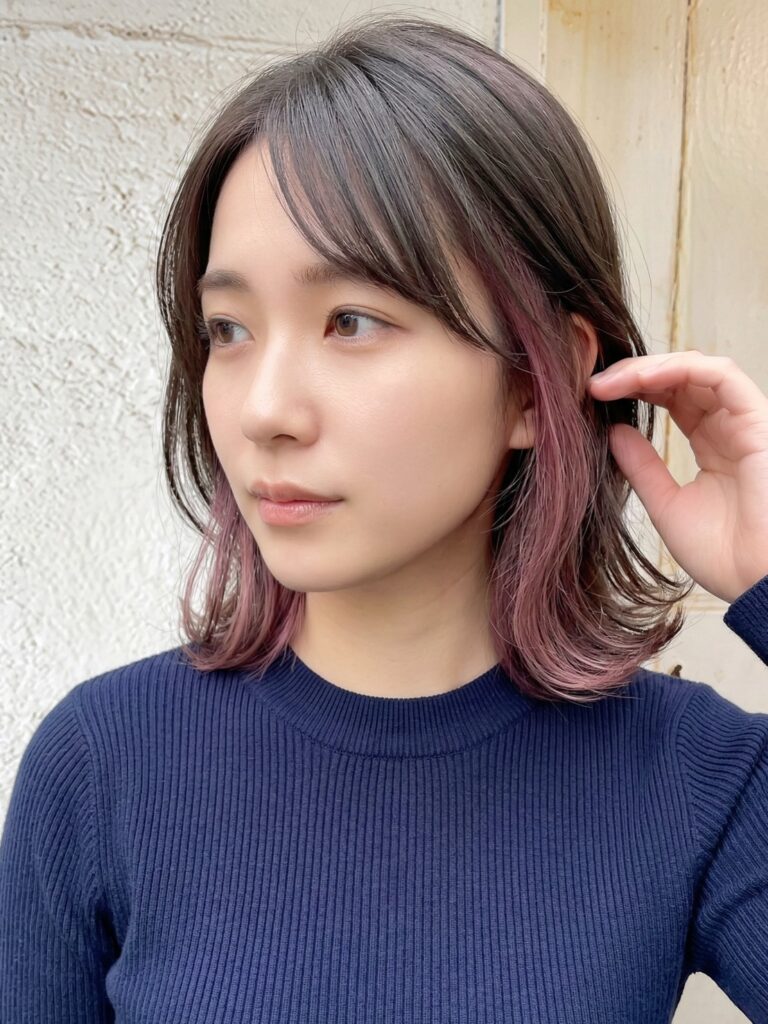 落ち着いた暗髪ベースに、濃いめのピンクアッシュを仕込んだミディアムスタイル。