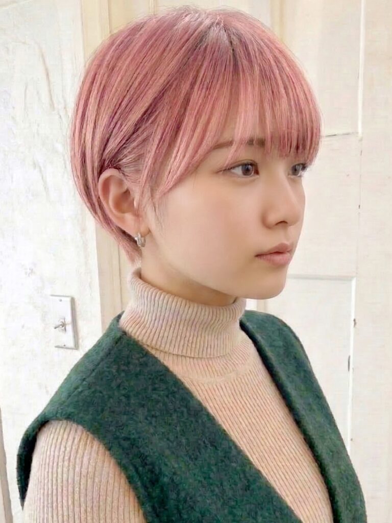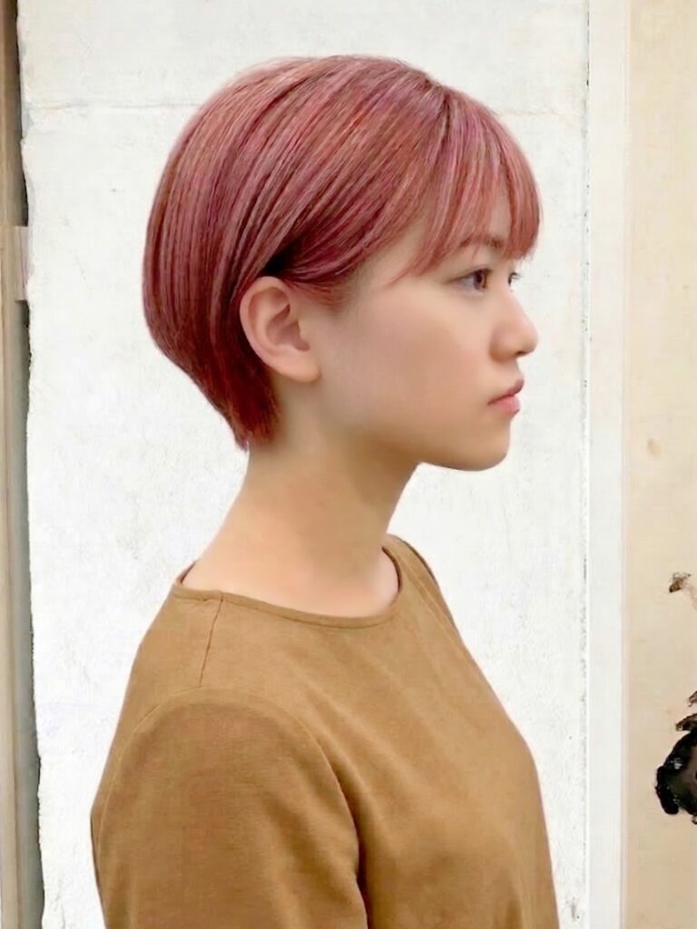 ふわっとした毛流れが出やすいショートレイヤーには、透け感のあるピンクベージュがぴったり。