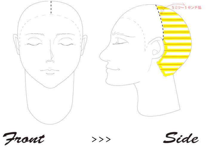 染まりにくい襟足から頭頂部に向けて、耳上から分け目に向けてカラー剤を塗布しましょう。