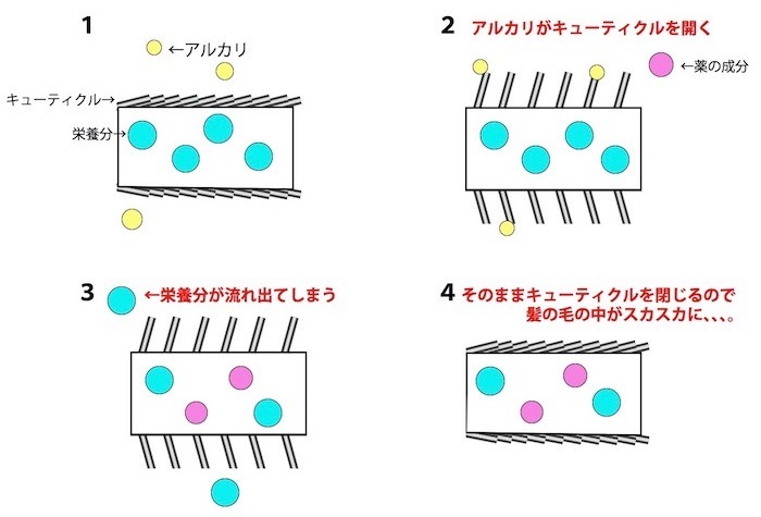 ▼アルカリカラーはキューティクルをしっかり開いて染める