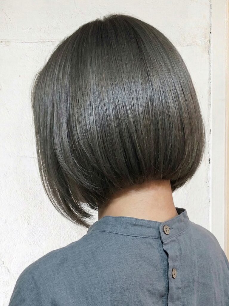 毛先までまとまりのあるボブにアッシュグリーンをプラスすることで、落ち着いた印象に仕上がります。
