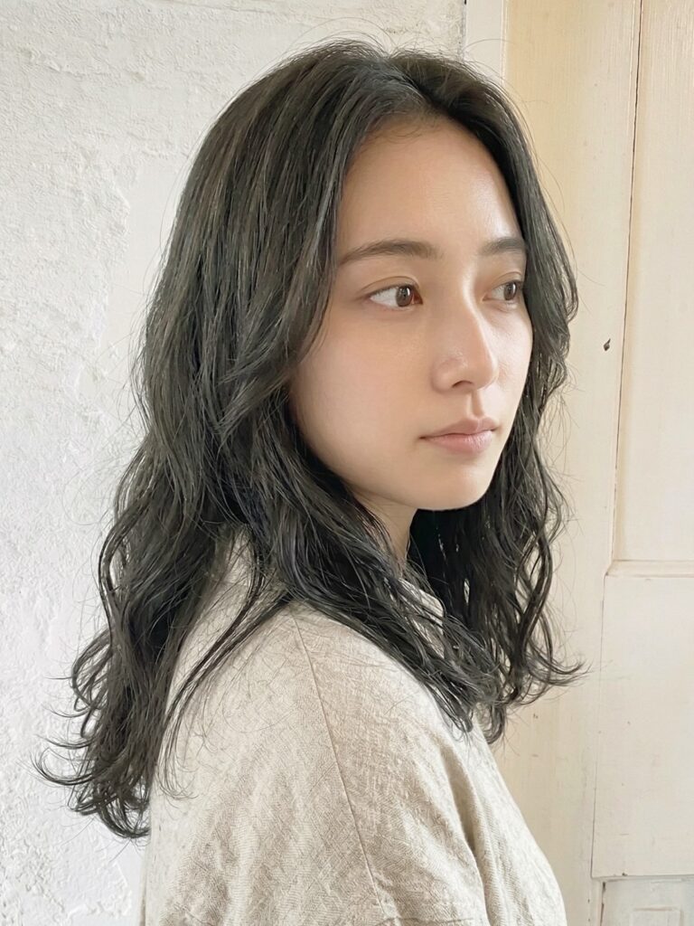 巻き髪が髪に自然な動きを与え、光の当たり方によってアッシュグリーンの透明感が際立ちます。