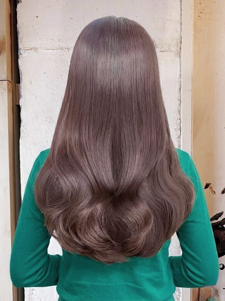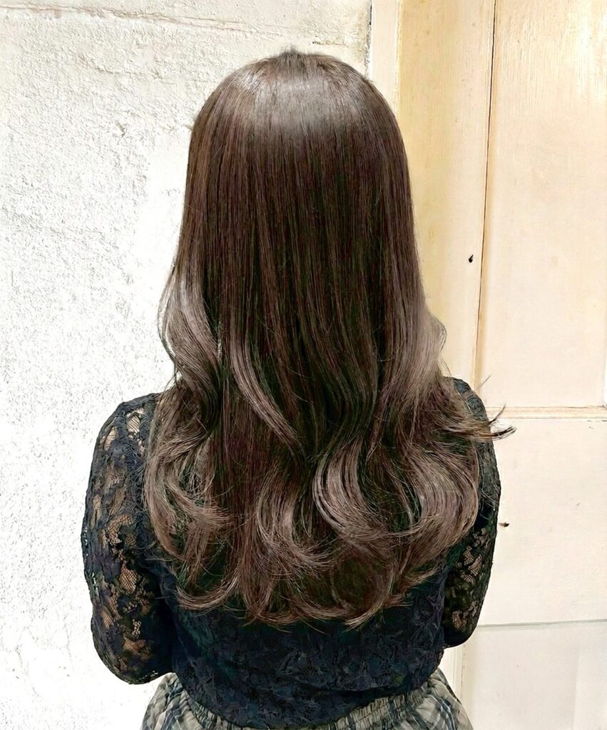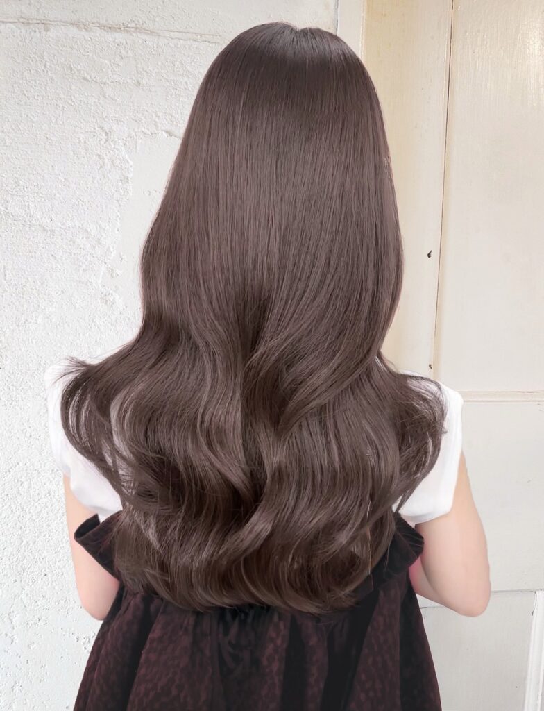 透明感あるくすみカラーと丸みのあるカールが相まって、上品かつトレンド感のあるロングスタイルになります。