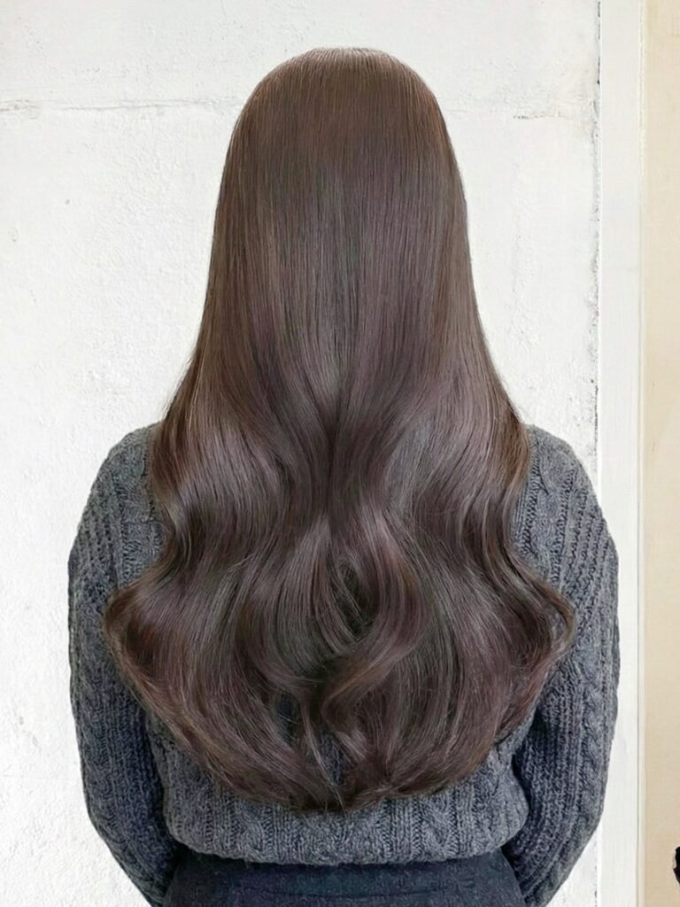 ショコラグレージュのツヤ感が髪の美しさを引き立て、重すぎない毛先とのバランスで軽やかな印象に。